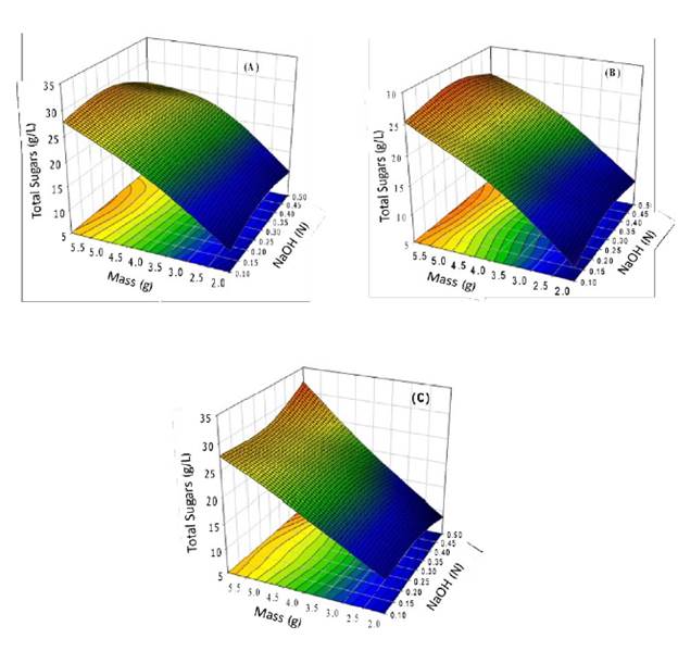 Fig. 1c shows the alkaline hydrolysis of RBB at 72 hours. he maximum concentration of total sugars was 32 g/L from 6 g of mass dry at a concentration of 0.5 N alkali. The interaction between the mass and alkali concentration was determined by test between subjects; the test shows that at 72 hours of reaction, the hydrolysis was significantly increased (5 g/L) than at 24 h. The increase of internal surface identifies the phenomenon that occurs with alkaline treatment on biomass, swelling, a decrease of polymerization degree and crystallinity, destruction of links between lignin and other polymers, and breakdown of lignin. he contact between the alkaline medium the RBB was the factor for the sugar increase from 27 to 32 g/L at 48 and 72 hours, respectively. However, the 32 g/L generated from bagasse can be used for ethanol production because they are cheap and renewable sources.