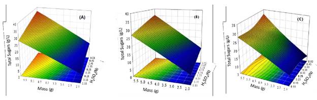 Fig. 2c presents the hydrolysis profiles of RBB at 72 hours. Te concentration of total sugars was 38 g/L. Te interaction between mass and acid concentration shows the interaction of factors. In 72 hours of reaction, the hydrolysis was significantly increased, 8.5 % higher than that obtained at 48 hours. With the multivariate test (Wilk's Lambda), the concentration of acid and mass of rbb have significant effects. Also, the increase in reaction time affected the hydrolysis due to the dissemination of acid to the matrix internally and the increased surface porous, which is consistent with the result obtained in this work, where the particle size was reduced and the effect of the mechanical treatment, together with the factor evaluated, favors the release of total sugars.