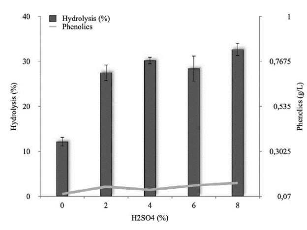 Hydrolysis at sterilization conditions. Different concentrations of H2SO4 (0, 2, 4, 6, and 8 % v/v) were applied to determine the best concentration for the release of sugars; the reaction was carried out at sterilization conditions (11 min, 121 °C, 1 kg/cm2). The experiments were conducted in 250 mL Erlenmeyer flasks. Six grams of dry RBB were placed in 50 mL of H2SO4 of different concentrations (0, 2, 4, 6, and 8 % v/v), then were sterilized in an autoclave for 11 minutes at 121 °C/1 kg/ cm2, and kept overnight at 20 °C. Samples were filtered to determine total sugars with a modified phenol-sulfuric method and phenolic compounds [22]. The percent of hydrolysis was determined concerning the total sugars and the dry weight of red beet.