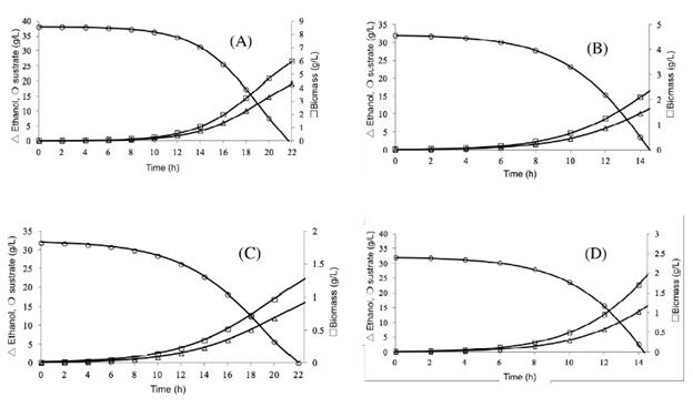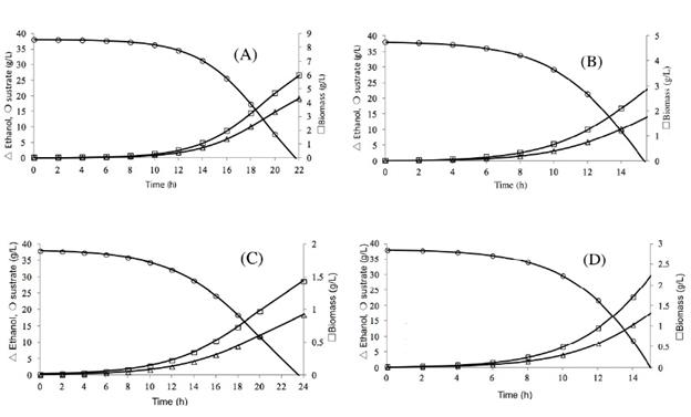 The ethanol production by S. cerevisiae ATCC 9763 was obtained between 14 and 22 h, the production of ethanol estimate by the model was 12 to 15.5 g/L with hydrolysates of alkaline treatment, the variability of these results can be explained by the initial concentration of sugar, due to theoretical yield were 73 to 94 y, both yields are similar.