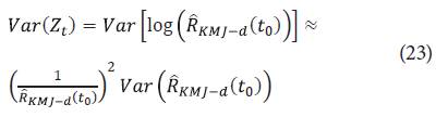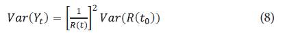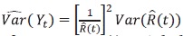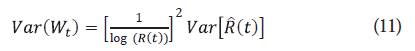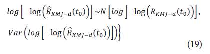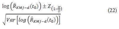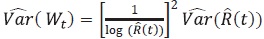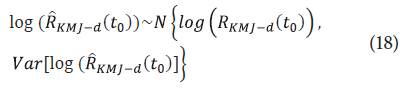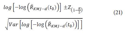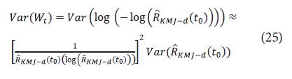 Donde . Como la función logaritmo es asimétrica, se puede utilizar la transformación logarítmica para estabilizar la varianza. De igual forma, para encontrar un IC para la función de confiabilidad mediante la transformación log(-log). Se define W(t)= log (- log(R(t))), se sigue por el método delta que: