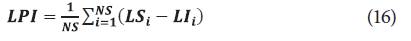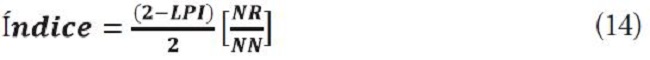 Donde NS es el número de simulaciones (1000), NR es el nivel cobertura real (tasa de intervalos que contienen al valor de referencia), NN es el nivel nominal del intervalo (95%) y LPI es la longitud promedio de los intervalos, donde: