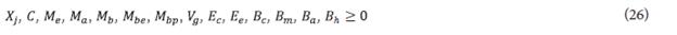 Constraints (6)-(11) are related to the capacity of the production processes for each considered product. Equations (12) allow satisfying the total demand for products of the company. Equations (13)- (23) corresponds to the balance of mass and energy for producing and generation of energy, steam, bagasse, cane syrup, sugar, honey "b," ethanol, and PHB. Equations (24) and (25) are related to the minimum generation of steam and bagasse. The minimum generation of steam is that required to supply the production processes of sugar, ethanol, PHB, and the transformation of bagasse. The minimum quantity of bagasse allows keeping the generation of steam and energy stable even when the cane is not crushed. Finally, equations (26) are the nonnegative constraints for the proposed model.