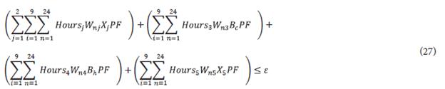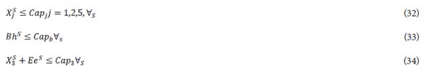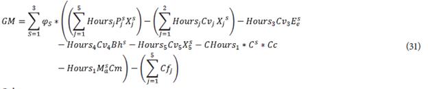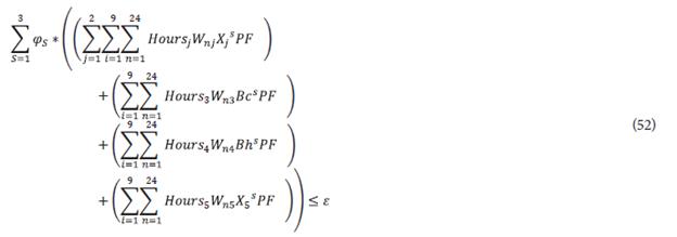 The stochastic objective function (31) considers the average value of the gross margin considering the three different scenarios. Note that constraints (32)-(51) are similar to those described above by (6)-(26). All these constraints consider the additional set of scenarios keeping the above description of their use for the considered problem. Finally, constraints (52) and (53) describe the average value of the objective function (5) by considering scenarios, and the epsilon constraint limits ([39]-[41]), respectively.
