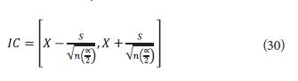 Where X = mean, s = standard deviation of the sample, ∝ = level of rejection for a confidence level of 95%, α = 5%, n = number of data.