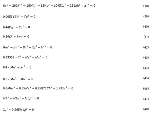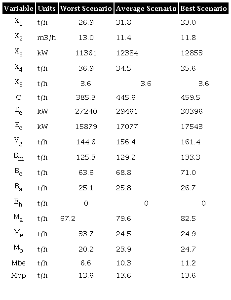 Xsj = Quantity of product j to be produced for the scenario s (i = 1 in ton /h, i = 2 ethanol in m3/h, i = 3 in kW, i = 4 in ton/h, i = 5 in ton/h)