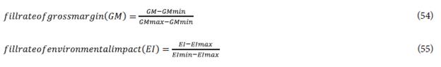 GMmin and EImin are the minimum values of the Gross Margin and the Environmental Impact, respectively. GMmax and GMmin are the maximum values of the both objective functions. Finally, GM and EI are the values for each evaluated fill rate point.