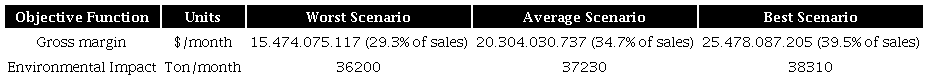 Table 3 shows the optimal solution of the MOSM for each scenario by considering the epsilon constraint method. The higher gross margin is obtained in the best scenario, but an environmental impact is also generated. In the best scenarios, the product prices and the demands are higher than the other scenarios by improving the gross margin and increasing the emissions of environmental load.
