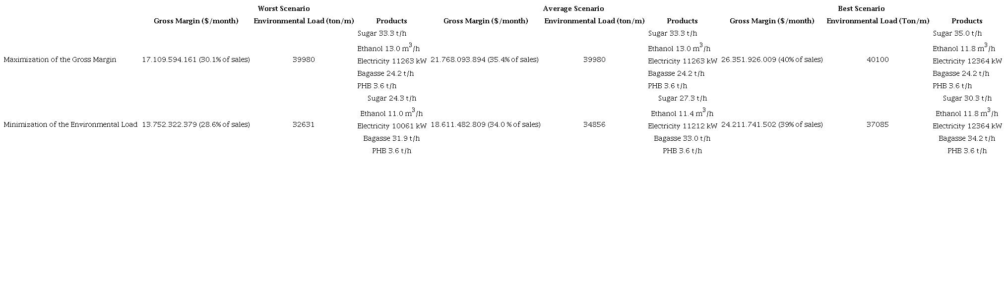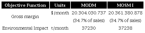 The best solution satisfying the criterion of equal fill rate to the considered objectives (GM and EI) in the MODM is: environmental impact of 37.230 ton/month and a gross margin of $ 20,304,030,737 per month. Table 1 shows the result to the problem of maximizing gross margin and minimizing the environmental impact for the production of sugar, energy, ethanol and PHB, i.e., the solution of MODM.