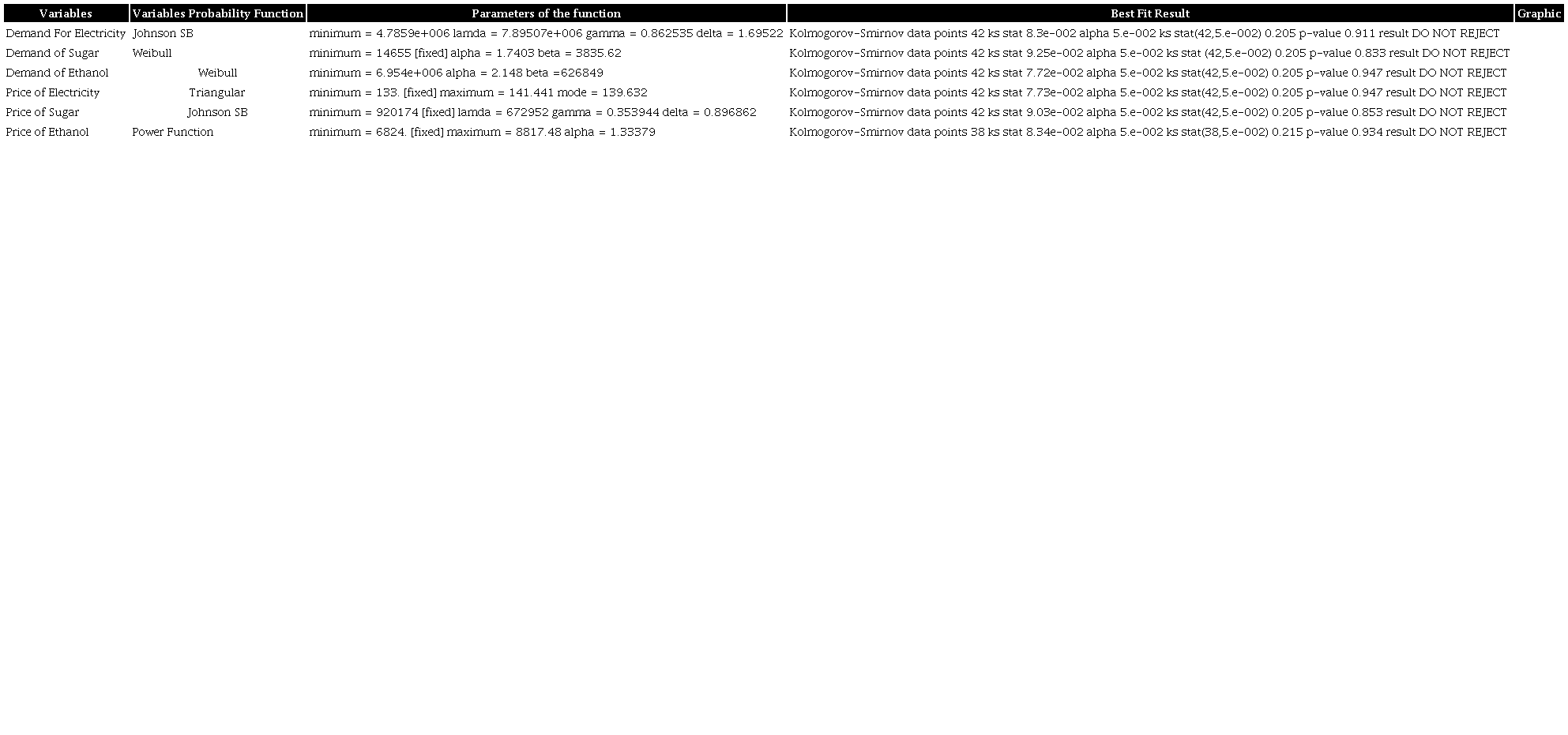 The mathematical model MODM considers the average values of the parameters for each product. However, we have evaluated the statistical performance of the following parameters' behavior to consider realistic aspects into a MOSM: Demand of Electricity, Demand of Sugar, Demand of Ethanol, Price of Electricity, Price of Sugar and Price of Ethanol (source obtained from company case study).