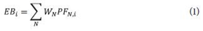 Where EBi = Environmental load of the category i, WN = Quantity of the substance N emitted and PFUN = Potential factor of the substance N in the category i. A substance could have a different potential impact for different categories; for example, nitrogen dioxide (NO2) has an impact factor of 0.7 for the Air Acidification category, 40 for the Global Warming category, and 0.2 for the Eutrophication category. [30] proposed a methodology for calculating the environmental load of a process (2):