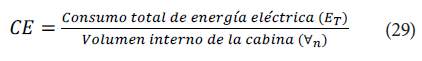 CE: Consumo específico. Relaciona el consumo total de energía eléctrica por cada litro de volumen neto de la cabina [14].