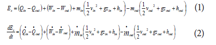 La primera ley de la termodinámica establece que la energía en un sistema donde se experimenta un proceso no se puede crear ni destruir, solo transformarse y conservarse. Esta energía se manifiesta en la frontera del sistema, y puede transferirse hacia o desde el mismo en tres formas: calor, trabajo y flujo másico. La energía que gane o pierda el sistema durante el estado inicial y el estado final del proceso se balancea con la diferencia entre las cantidades transferidas hacia dentro y hacia fuera del sistema [16]. Las ecuaciones (1) y (2) expresan la primera ley de la termodinámica en su forma energética y en su forma de transferencia energética, respectivamente.