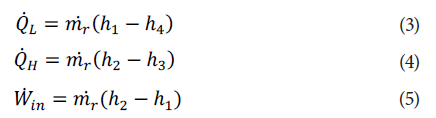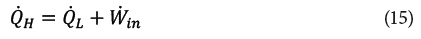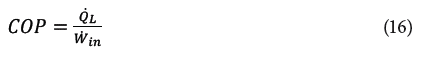 Aplicando la segunda ley de la termodinámica al balance energético de la ecuación (15), se identifica que, de todo el calor rechazado al ambiente (Q̇H), la calidad energética es el calor extraído (Q̇L) de la cabina, que se produce artificialmente por una fracción de trabajo (Ẇin) introducido al sistema. Considerando el concepto de eficiencia energética, el ciclo de refrigeración óptimo es aquel que remueve el mayor calor del espacio refrigerado, empleando el mínimo trabajo posible. A esta relación se denomina coeficiente de rendimiento (COP) y se calcula de la siguiente manera: