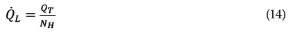 Las energías térmicas de Q̇1, Q̇2, Q̇3 Y Q̇4 se cuantifican para un periodo de 24 horas al día, mientras que las horas de funcionamiento de las ganancias de calor para motores, iluminación y dispositivos electrónicos dependerá de lo que establezca el fabricante. De esta forma la potencia frigorífica requerida se calcula tomando la energía térmica diaria y dividiéndola entre las horas de funcionamiento al día del compresor, que se estiman entre 14 y 18 horas [19], como indica la ecuación (14). Esto permite al refrigerador tener una reserva de potencia distribuida en ciclos de encendido y apagado del compresor durante el día [20].