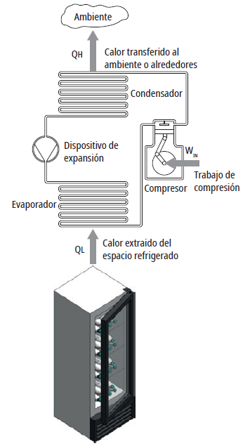 Un refrigerador funciona mediante un proceso termodinámico que extrae calor de un recinto cerrado y de los cuerpos contenidos dentro para bajar la temperatura [15]. Este proceso, denominado refrigeración, está fundamentado en las leyes de la termodinámica, y sus aplicaciones son múltiples. La ley cero de la termodinámica establece que la diferencia de temperatura entre dos cuerpos produce naturalmente una fuerza impulsora que transfiere un flujo de calor desde el cuerpo a mayor temperatura hacia el cuerpo de menor temperatura, hasta alcanzar el equilibrio térmico [16]. El enfriamiento a temperatura menor respecto al entorno no es un sistema termodinámico natural [17]. Por tanto, para lograr la transferencia de calor desde el cuerpo de menor temperatura hacia el cuerpo de mayor temperatura es necesario introducir al sistema termodinámico energía en forma de trabajo.