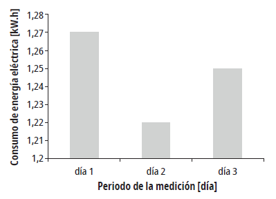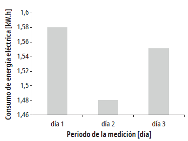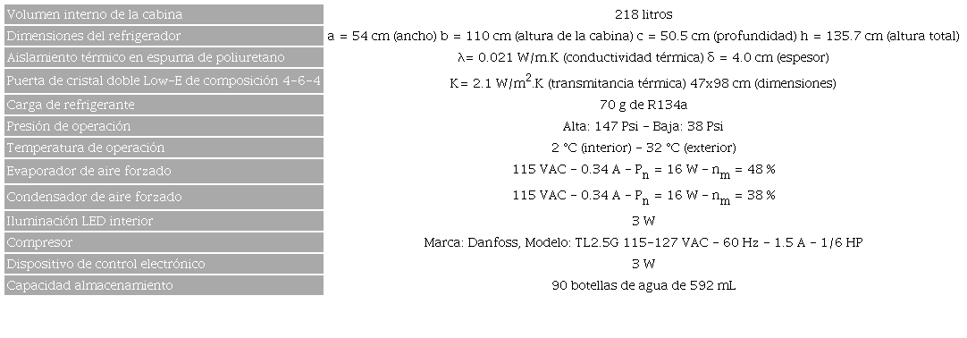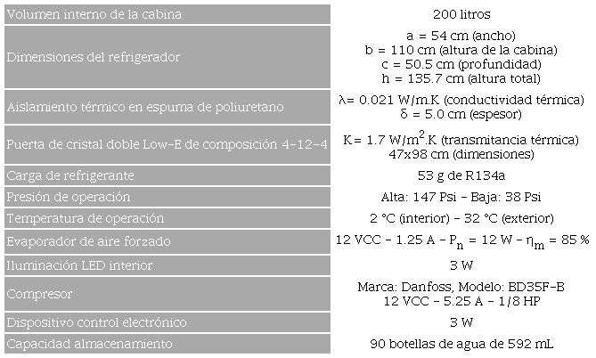 Las pruebas se realizaron en Cali, Colombia, y se utilizó un vatímetro de referencia TS-1500 y un Data logger marca Hanna, referencia HI143, para medir el consumo eléctrico y la temperatura en la cabina, respectivamente. La carga de producto en cada refrigerador fue de 90 botellas de agua de 592 mL. El escenario más desfavorable para hacer las mediciones consistió en situar bajo techo y a la intemperie (temperatura de 32 °C) ambos refrigeradores, y durante tres días consecutivos, sin carga de producto, y otros tres días consecutivos con carga de producto, los instrumentos arrojaron los siguientes resultados.