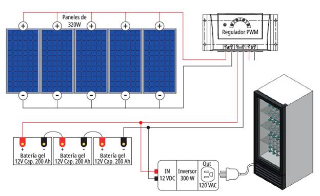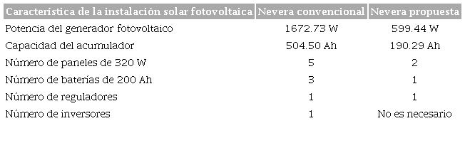 El acumulador consta de baterías de gel de ciclo profundo, y su capacidad se calcula con la ecuación (20), considerando un día de autonomía, una profundidad de descarga del 80 %, una tensión de 12 VDC, un rendimiento del 90 % y 100 % para el inversor en el refrigerador convencional y el propuesto, respectivamente, y un rendimiento del 93 % para el regulador y las baterías. El regulador se selecciona evaluando las condiciones de las ecuaciones (18) y (19). La potencia mínima del inversor debe corresponder con la potencia del refrigerador convencional, mientras que para el refrigerador propuesto no hace falta su uso, porque el equipo funciona en DC. El panel fotovoltaico usado corresponde al módulo solar policristalino, referencia PPS320W de 320 W marca Netion; la batería empleada es de gel de ciclo profundo, referencia UCG200-12, marca Ultracell, con capacidad de 200 Ah y tensión de 12 V; el regulador de carga seleccionado es de la marca Steca, modelo Solaris y referencia PR 3030. De este modo, la tabla 13 muestra la instalación fotovol-taica dimensionada para ambos refrigeradores: