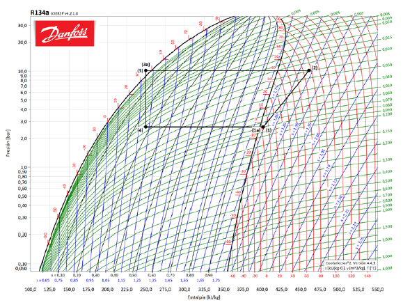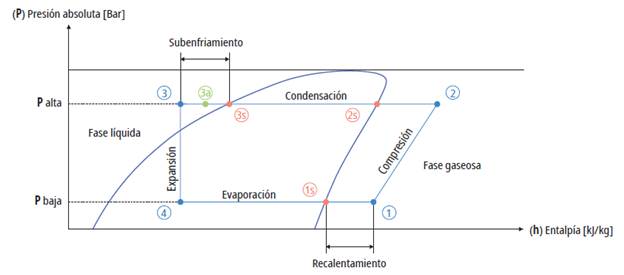 Con el diagrama de Mollier se pueden calcular las potencias frigorífica y calorífica, además del trabajo requerido en el compresor, usando las siguientes ecuaciones:
