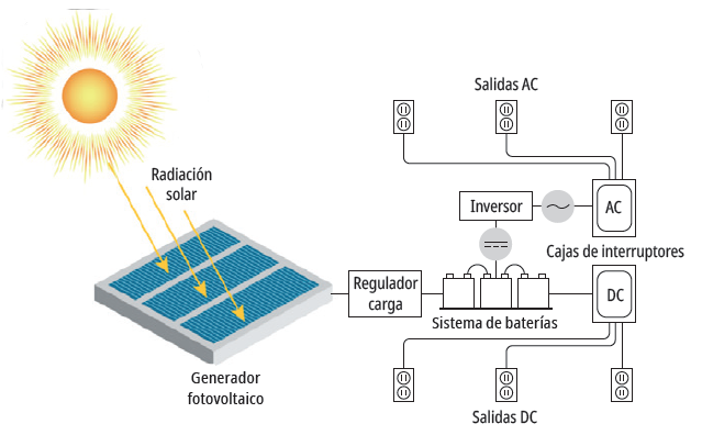 Normalmente son de autoconsumo y potencia modesta, sin conexión a la red y utilizadas en los sectores doméstico, de telecomunicaciones y en zonas rurales [21]. El generador fotovoltaico entrega la potencia necesaria a la instalación y se conforma de un arreglo de paneles fotovoltaicos que convierten una fracción de la radiación solar en electricidad DC [22]. Un controlador de carga regula el valor de la tensión nominal en DC a la que trabajan los elementos de consumo y las baterías, además de que evita sobrecarga y sobre descarga del sistema de acumulación, prolongando su vida útil [22]. El acumulador, compuesto de un arreglo de baterías, se encarga de almacenar una reserva energética para proporcionar electricidad durante los periodos nocturnos o de nubosidad [22]. El inversor transforma la corriente continua en la corriente alterna requerida por los aparatos consumidores o la red eléctrica [22]. A continuación, se muestra el esquema generalizado de una instalación solar fotovoltaica para autoconsumo: