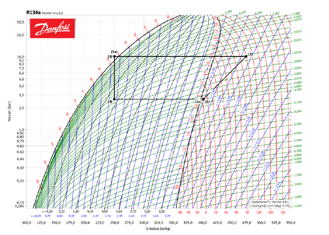 El software Coolselector valida la selección del compresor TL2.5G instalado en el refrigerador convencional y genera el diagrama de Mollier, tal como se aprecia en la figura 6.