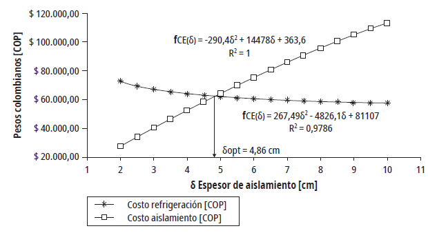 Graficando las dos funciones económicas se determina el espesor óptimo de aislamiento, en el punto de intersección entre ambas funciones, como se advierte en la figura 7.