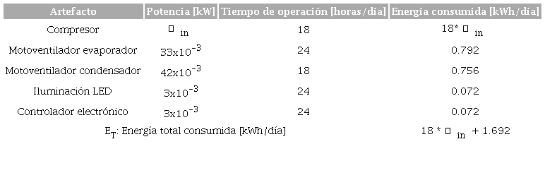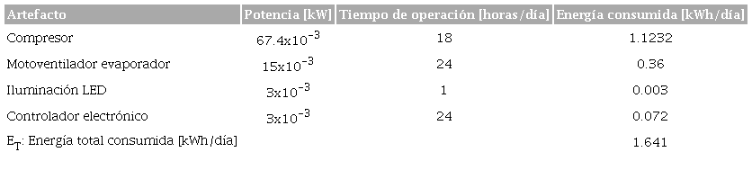 Al reducir la potencia calorífica se determina que es factible emplear un condensador estático que disipe el calor al ambiente mediante convección natural y sin usar un motoventilador. La tabla 10 presenta el consumo energético aproximado del refrigerador propuesto.