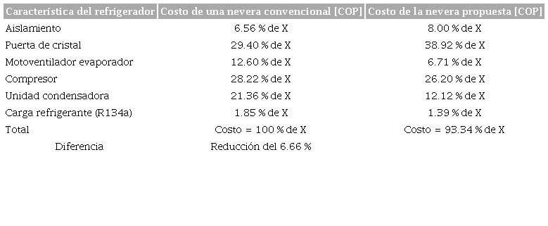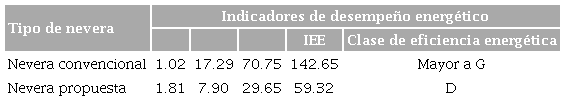 El coeficiente de energía señala que el refrigerador convencional gasta 1 Wh de energía eléctrica para producir 1 Wh de energía térmica frigorífica, mientras que el refrigerador propuesto produce casi el doble de energía frigorífica por cada Wh de electricidad consumida. El consumo específico muestra que el refrigerador propuesto usa alrededor de la mitad de la electricidad consumida por el refrigerador convencional por cada litro de volumen neto en la cabina. El consumo específico del producto establece que la nevera propuesta ahorra un 58 % de la energía consumida por la nevera convencional para la refrigeración de los productos. El índice de eficiencia energética del refrigerador convencional es tan alto que no se puede clasificar, mientras que el refrigerador propuesto se clasificó en D. Se destaca que el costo de fabricar el nuevo refrigerador fue casi un 7 % menor que el costo de fabricación del equipo convencional, lo que permite señalar que es factible mejorar la eficiencia de un equipo a un costo favorable.
