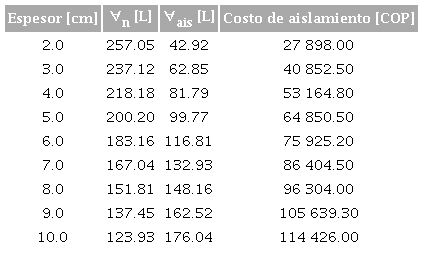 Tabulando diferentes espesores y usando las ecuaciones (21), (22), (24) y (25) se obtiene el costo del aislamiento térmico mostrado en la tabla 3: