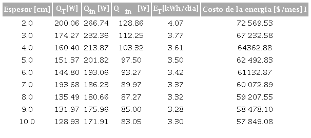 Tabulando diferentes espesores de aislamiento térmico y usando la ecuación (26) se obtiene el costo energético mensual, que se muestra en la tabla 5.