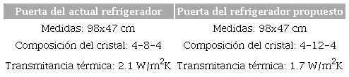 Los refrigeradores comerciales emplean para sus puertas unidades de vidrio aislante de doble cristal, separados por una capa de aire y gases inertes, donde uno de los cristales es de baja emisividad, para evitar condensación y proporcionar un aislamiento térmico reforzado [32]. Esta medida propone aumentar la capa de aire y gases inertes para mejorar la composición del vidrio y disminuir la transmitancia térmica, como lo muestra la tabla 6.