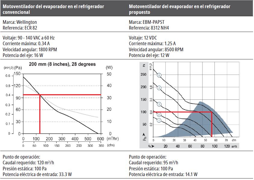 El rango obtenido para seleccionar el nuevo motoventilador está entre 92.50 m3/h y 117.65 m3/h. Explorando distintos fabricantes, se seleccionó un motoventilador de la marca EBM-PAST con un caudal de 95 m3/h, que cumple con el rango establecido. La tabla 8 compara las características del actual motoventilador, que en realidad maneja 120 m3/h, y el motoventilador elegido.