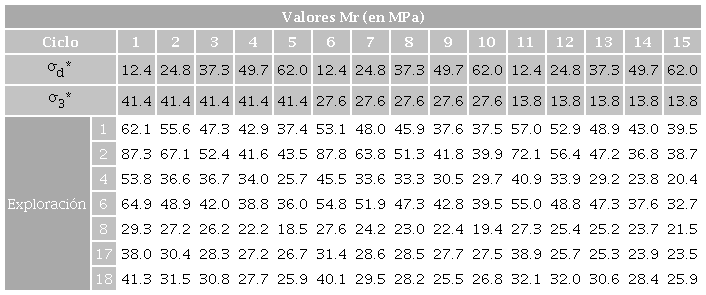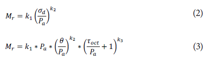 Aquí, Mr es el módulo resiliente en MPa, Pa es la presión atmosférica (establecida como 102 kPa en Bogotá), σd es el esfuerzo desviador en MPa, θ el esfuerzo bulk en MPay Toct elcortante octaédrico en MPa.