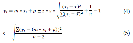 Para calcula r los intervalos de predicción, asumiendo que los datos de Mr y Eequ¡ utilizados se ajustan a una ddistribución normal, se hace uso de (4), donde m es la pendiente de la regresión, p el punto de corte con e 1 eje "y", n el número de datos (15 en este caso, que corresponden a los obtenidos en el ensayo de Mr), s es una constante calculada con (5), z es el nivel de confianza y x̅ es el promedio de los valores de σd.