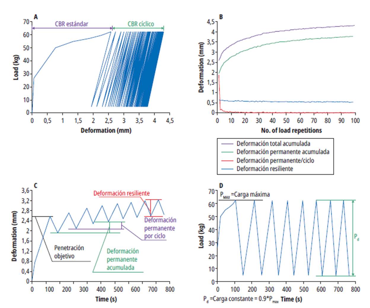 De manera más detallada, el ensayo de CCBR consiste en utilizar tres muestras inalteradas idénticas, contenidas en moldes de CBR, y penetrar cada una de ellas a una profundidad diferente (alrededor de 2.54 mm, 1.27 mm y 0.625 mm), registrando el esfuerzo requerido para alcanzar esa profundidad; este esfuerzo se aplica y se retira de manera repetida durante al menos 100 ciclos a una velocidad de 1.27 mm/min, hasta alcanzar un comportamiento resiliente, donde la variación en la deformación permanente entre ciclos consecutivos es menor a 3 %. Para asegurar un contacto permanente entre la muestra y el pistón, en el proceso de descarga se llega a una carga equivalente de cerca del 10 % de la registrada para la penetración objetivo (figuras 1c y 1d). La deformación resiliente que se utiliza para los análisis corresponde al promedio de las presentadas en los últimos cinco ciclos de ensayo.