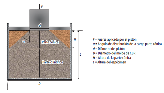 Del CCBR se determina el Eequ¡ , que representa una medida promedio de la rigidez de una muestra a niveles de esfuerzo superiores a los aplicados en un ensayo triaxial cíclico. Opiyo [10] desarrolló tres ecuaciones para estimar ese módulo en función del esfuerzo aplicado y la deformación recuperable: una de ellas es una ecuación empírica que asume que la deformación elástica ocurre en una parte cónica y en una parte cilíndrica, siendo la deformación total la suma de ambas (figura 2); otra es una simulación de elementos finitos, en la cual se asume una fricción total entre el molde y la muestra; y la última es una simulación que establece un deslizamiento total entre el molde y el suelo. Adicionalmente, cabe resaltar que las simulaciones aquí trabajadas utilizan un estrecho rango de propiedades elásticas (relación de Poisson y módulo de elasticidad) para obtener los resultados.