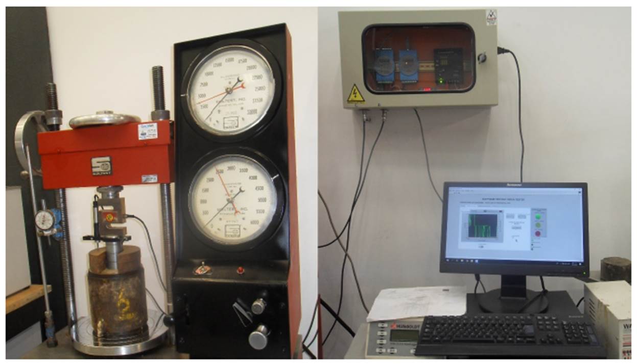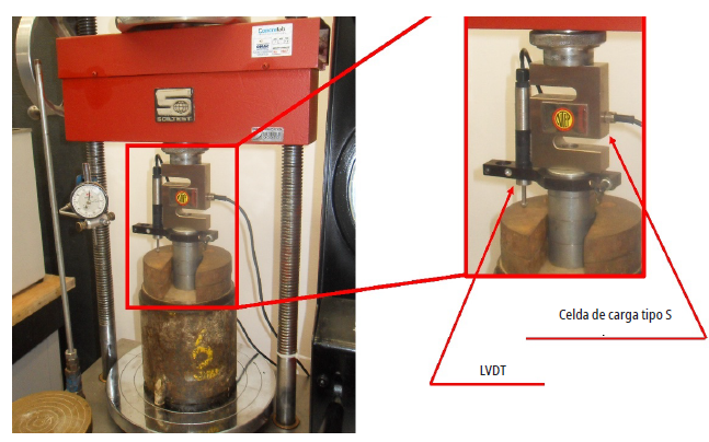 En este estudio, la toma de datos de carga y deformación se realizó mediante un sistema de adquisición de datos compuesto por una celda de carga tipo S, un transductor de desplazamiento y un software desarrollado en LabviEW, tal como se observa en las figuras 3 y 4.