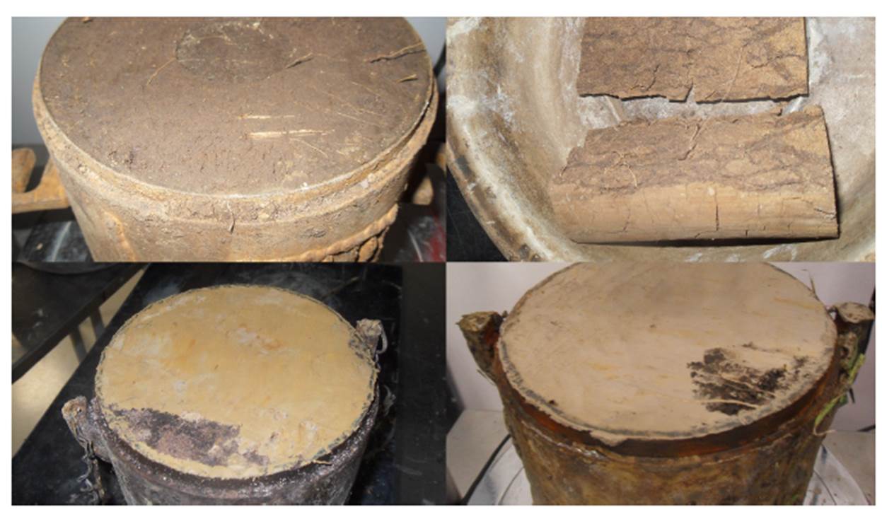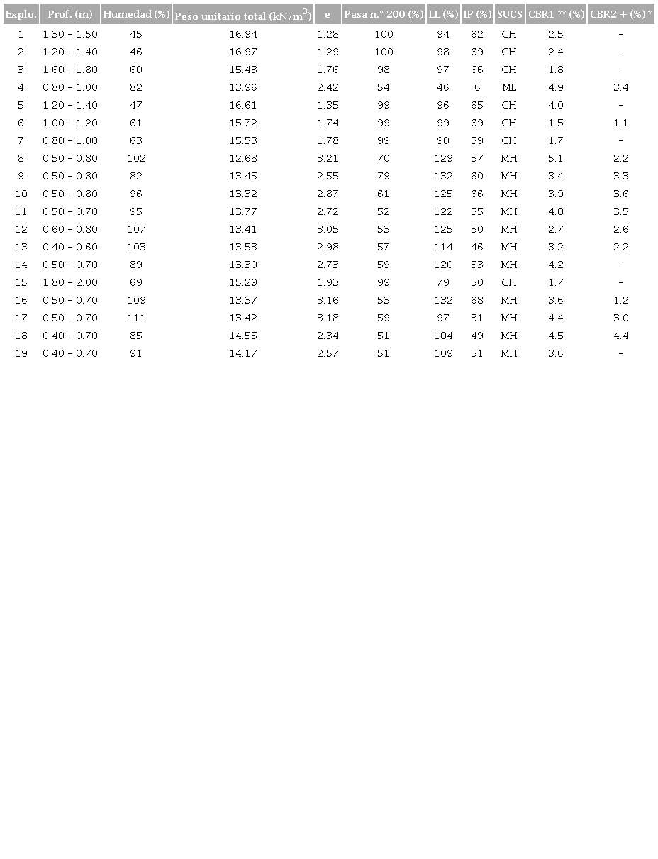 En la tabla 1 se presentan los resultados de la caracterización física y mecánica (CBR sobre muestra inalterada) de las muestras obtenidas de cada una de las exploraciones. Tal como se observa, en el estudio se incluyeron muestras de arcilla y de limo de alta compresibilidad (CH-MH) y limos de baja compresibilidad (ML) que, en algunos casos, tenían raíces y trazos de materia orgánica (figura 5). En general, los suelos analizados tienen valores de Gs comprendidos entre 2.68 y 2.72, y un grado de saturación entre el 86 % y el 96 %, valores típicos a las profundidades evaluadas de suelos que se encuentran en zona lacustre [14], [15].