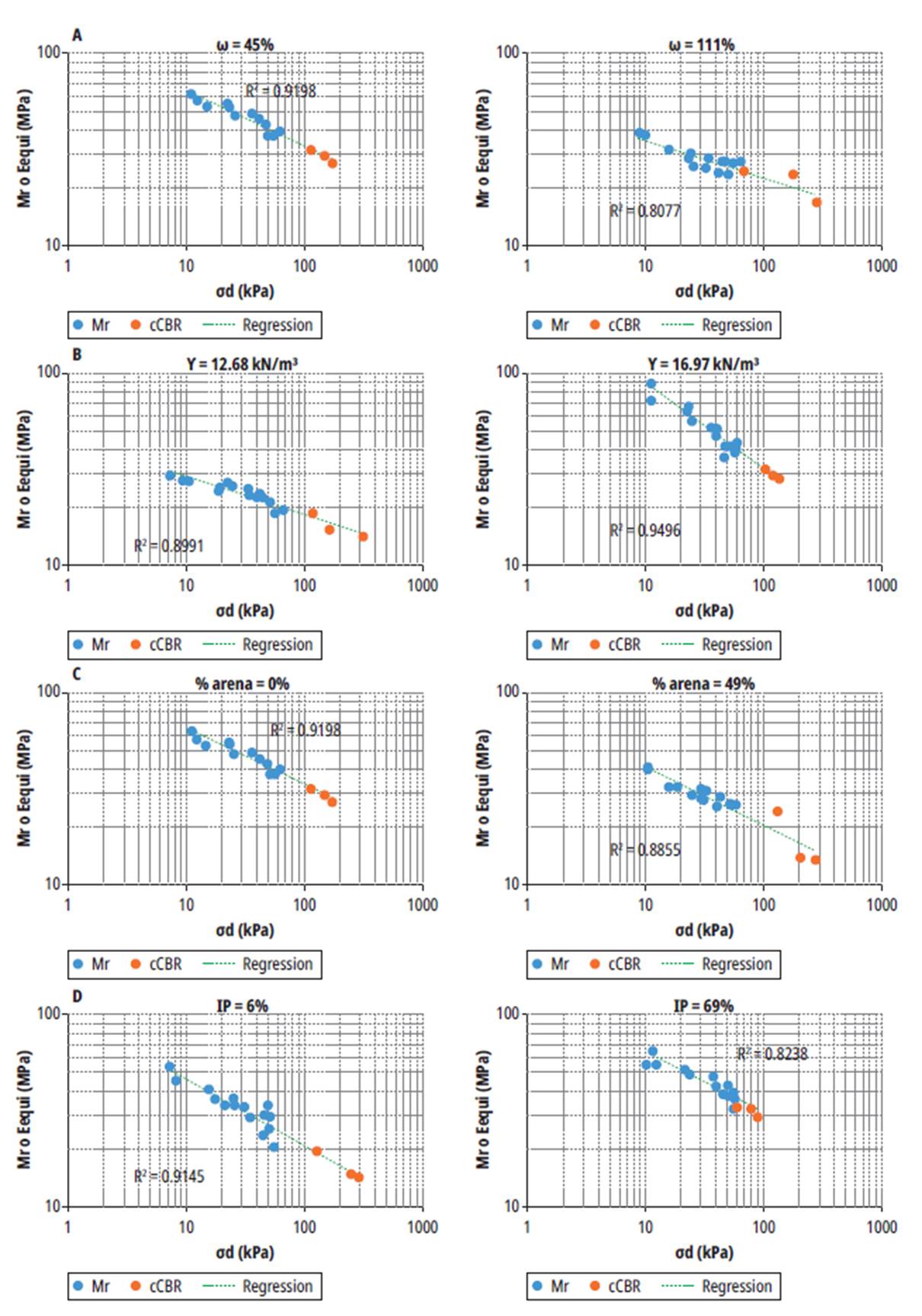Tal como se presenta en (2), en el modelo k - σd el esfuerzo desviador es el único atributo para evaluar el comportamiento del módulo. Con el fin de validar los resultados obtenidos del ensayo de cCBR para hallar valores de Mr, el procedimiento consistió en hacer uso del análisis de regresión.