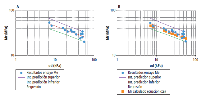 Para este caso particular, se realizó el análisis para determinar los intervalos de predicción, con un 95% de confiabilidad (z = 1,96), a partir de los resultados del ensayo de Mr (figura 7a); posteriormente, utilizando el modelo constitutivo k - σd obtenido del ensayo de CCBR, se calculan los Mr a los mismos niveles de esfuerzo del ensayo Mr. Se considera que el modelo constitutivo presentado en el CCBR es adecuado para determinar el Mr a bajos niveles de esfuerzo, si dichos valores calculados caen dentro de los intervalos de predicción (figura 7b).
