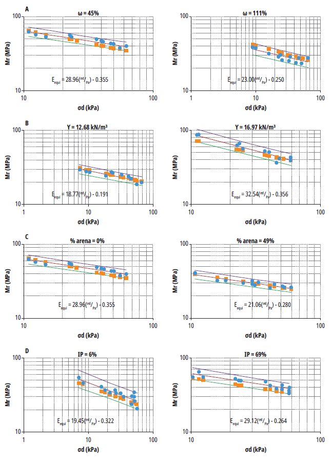 En este documento se presentan únicamente algunos de los resultados, considerados representativos del buen ajuste obtenido en general, correspondientes a las muestras de menor y mayor humedad (exploraciones 1 y 17), peso unitario (exploraciones 8 y 2), contenido de arena (exploraciones 1 y 18) e índice de plasticidad (exploraciones 4 y 6). Los valores de Mr y Eequ¡ encontrados se muestran en las tablas 2 y 3, respectivamente.