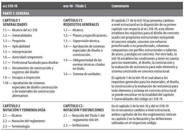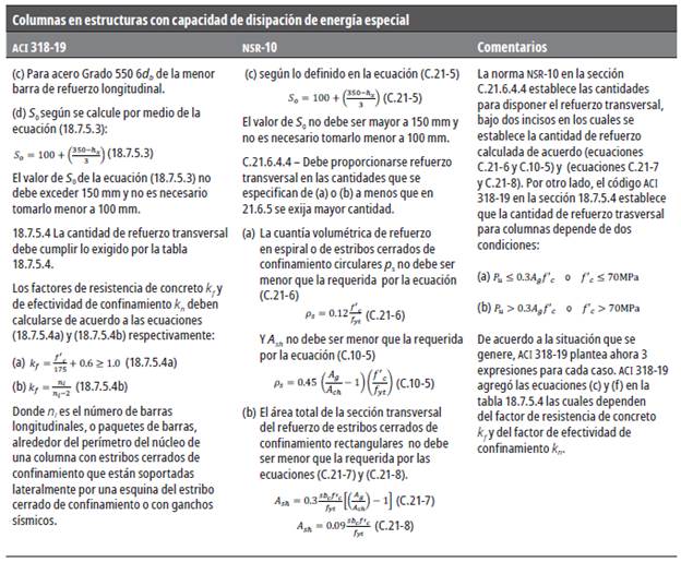 Todos los cambios encontrados en la comparación entre NSR-10 y ACI-318-19, que se omiten aquí debido a lo extensa que resulta la comparación, pueden consultarse en el siguiente enlace: https://www.researchgate.net/publication/360106912_Comparison_between_ACi-318-19_and_NSR-10_for_structural_design_of_concrete_frames_in_ high_seismic_hazard_zones