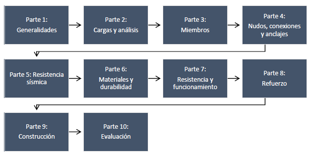 En cuanto al orden, disposición y contenido de cada uno de los capítulos que conforman cada normativa, se evidenció una sustancial transformación en la organización de los capítulos. En primera instancia, el reglamento ACI 318-19, desde la edición de 2014, incorporó modificaciones trascendentales a propósito de su organización y disposición estructural. Está dividido en diez partes, tal como se muestra en la figura 5. El objetivo de este reglamento es presentar un lenguaje claro y consistencia de estilo, para que los ingenieros tengan la seguridad de que han cumplido con todos los requisitos necesarios establecidos en el código. El índice se rehízo por completo, porque ahora presenta todos los requisitos para diseño y detallado de los sistemas y miembros estructurales de manera individual en cada capítulo, que, a su vez, sigue el proceso lógico y cronología de diseño y construcción. Por su parte, el título C de la norma NSR-10 sigue la estructuración del ACI-318-08, en la que no hay una organización ligada a la secuencia de diseño por elementos; por el contrario, se mezclan los requerimientos de los elementos estructurales en diversos capítulos a lo largo del reglamento [5].