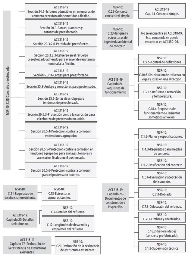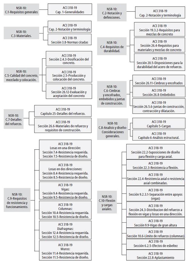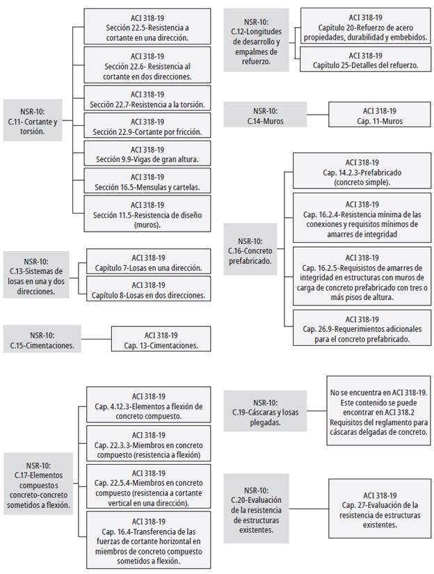 En diferentes capítulos del reglamento colombiano, se puede evidenciar un impacto aun mayor, como en el capítulo C.9 que dispone los requisitos de resistencia básica y condiciones de funcionamiento para el diseño de elementos de concreto estructural. Su contenido se encuentra en 12 secciones del reglamento ACI 318-19. Lo mismo ocurre con el capítulo C.18 que establece las disposiciones que se deben aplicar para realizar el diseño de diferentes elementos sometidos a flexión o cargas axiales. En él, su contenido se encuentra distribuido en diez secciones del reglamento ACI 318-19. En total, 14 de los 23 capítulos del reglamento NSR-10 presentan cambios en su disposición y contenido con respecto al americano. En otras palabras, poco más del 60 % de los capítulos del colombiano registran cambios en el aspecto estructural en comparación con el ACI 318-19.