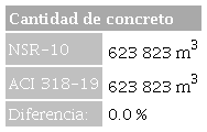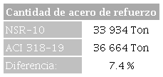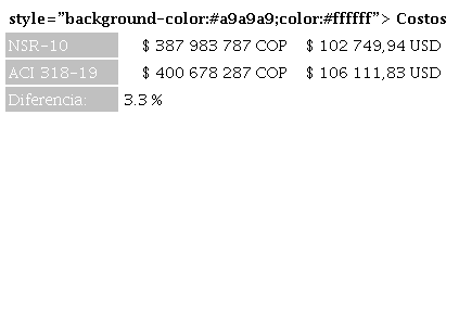 El comparativo final se basa en la compilación de las cuantías de refuerzo y volúmenes de concreto, por medio del cual fue posible hacer un análisis porcentual aproximado de los costos que generaría la aplicación de las nuevas especificaciones establecidas en el código ACI 318-19 comparado con la NSR-10.