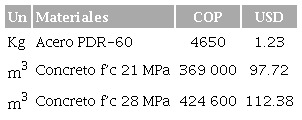 Después, con las cantidades obtenidas y con ayuda de la base de datos del Invías, con la que se determinó el costo unitario del acero de refuerzo y del concreto, se calculó el costo de los materiales para cada alternativa. La tabla 4 muestra, de acuerdo con las bases de datos investigadas, el costo unitario de cada material.