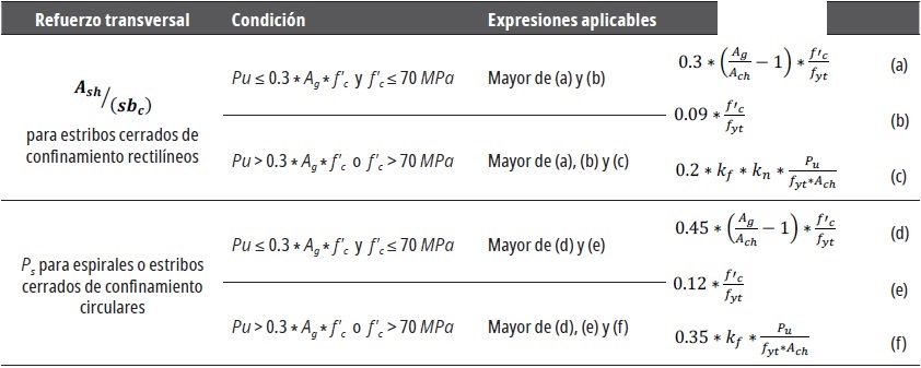 De acuerdo con la situación que se genere, ACI 318-19 plantea ahora tres expresiones para cada condición y no dos como se advierte en la NSR-10, en la que ACI 318-19 agregó las ecuaciones (c) y (f) dentro de la tabla 18.7.5.4, lo cual conduce a que la cantidad de refuerzo transversal en columnas dependa del factor de resistencia de concreto kf y del factor de efectividad de confinamiento kn.