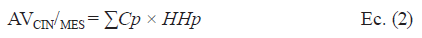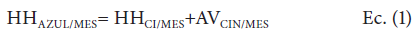 Donde: HHAZUL/MES se refiere a la HHazul mensual (m3/mes); HHCIN/MES corresponde al consumo directo de agua (m3/mes) y AVCIN/MES se relaciona con el agua virtual que se obtiene a partir del consumo indirecto (m3/mes).