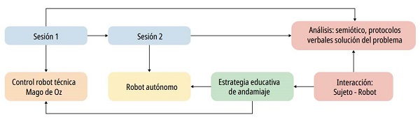 La propuesta del diseño de la investigación se conforma en las tradiciones de investigación en el campo de solución de problemas, robótica y HRI [21, 22], Así, el enfoque es mixto, el diseño cuasiex-perimental y el alcance exploratorio. Estas características reconocen los tres campos para explicar y comprender el fenómeno de interacción entre sujetos y herramientas con agentividad. De los tres campos, la solución de problemas tiene mayor tradición en investigación; la robótica por su parte tiene una tendencia positivista en función de validar los sistemas electromecánicos y de control. Finalmente, el campo de HRI, es un campo en una fase temprana de desarrollo, en donde las propuestas de investigación aún se están estructurando. La mayoría de literatura consultada que da cuenta de procesos de validación de interacción entre humanos y robots consideran aspectos como: instrumentos utilizados para la recolección de datos, cantidad de sujetos en el proceso de validación, ubicación del lugar de los experimentos (escuela o laboratorio) y tiempo de interacción. El diseño propuesto integra una técnica no muy utilizada en esta área; los protocolos verbales.