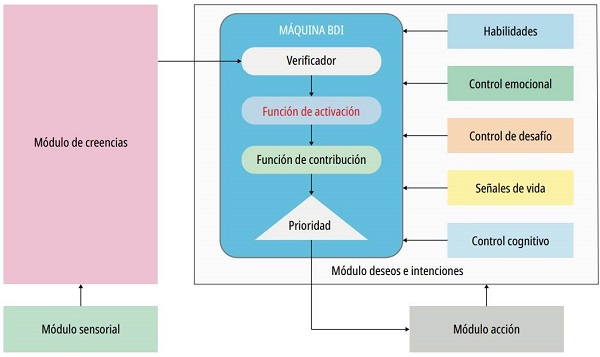 El módulo de creencias evalúa el conocimiento operativo del sujeto para resolver el juego, las habilidades para resolver el juego y el estado emocional del sujeto entre ansiedad, fluir y aburrimiento. El módulo de deseos e intenciones diseñado con base en la teoría de andamiaje está representado por los cinco grupos de acciones, en los cuales está inspirada la teoría psicológica del fluir.